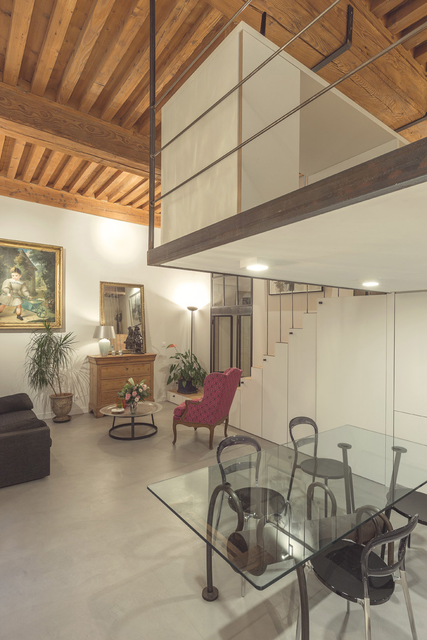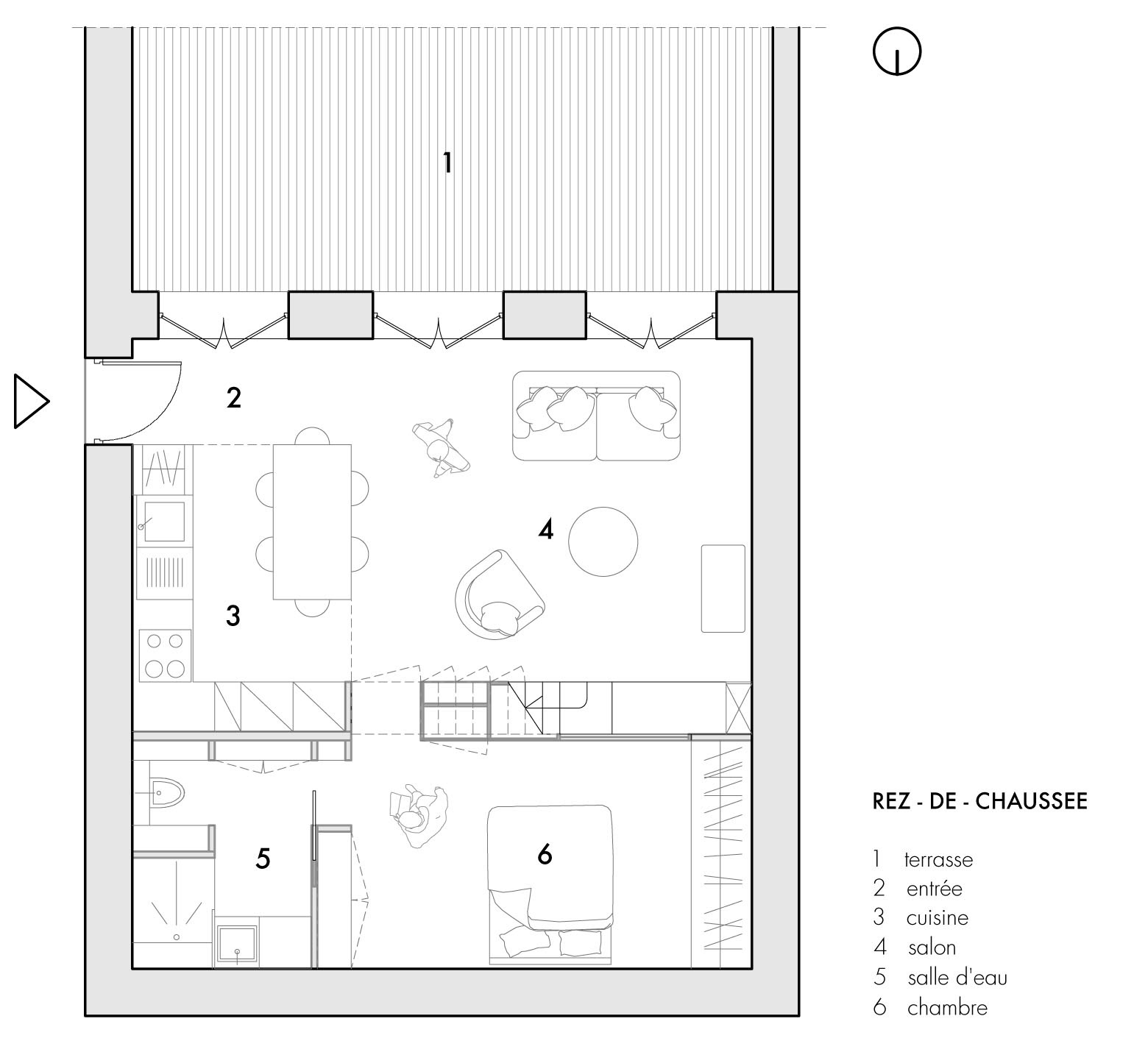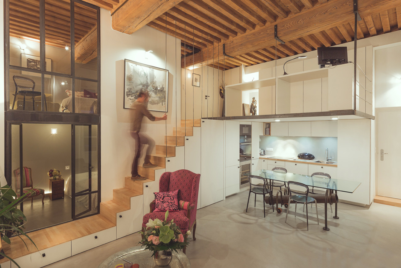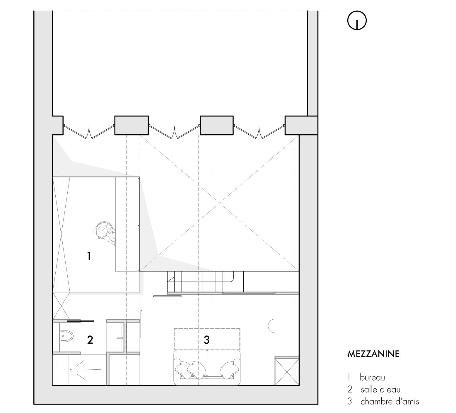 Le projet s'est donc attaché à minimiser toutes les épaisseurs, afin de gagner un maximum de hauteur dans les mezzanines (minimum 180cm). Au rez-de-chaussée, un espace de vie généreux distribue une chambre en second jour. Une mezzanine suspendue vient animer la double hauteur et créer un lieu de travail ludique et fonctionnel. Un deuxième espace modulable peut être fermé grâce à une verrière coulissante et devenir une chambre d'amis.