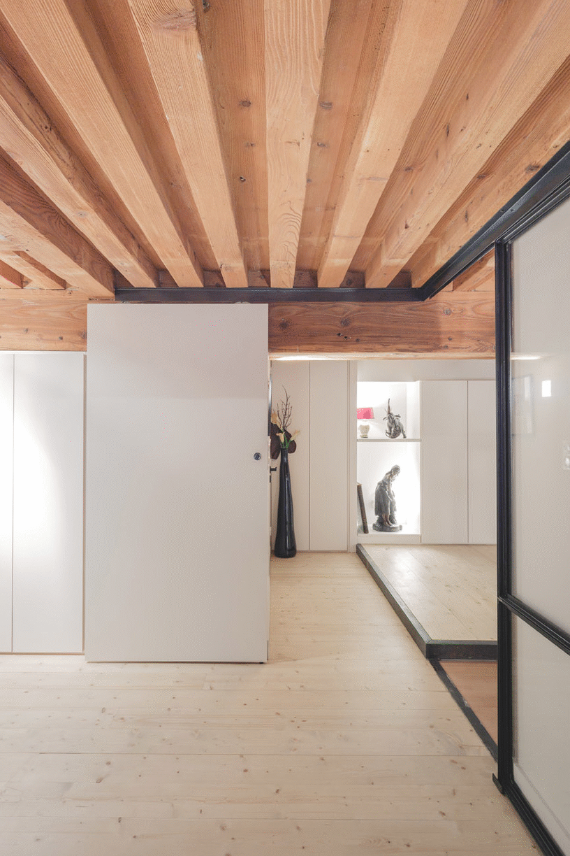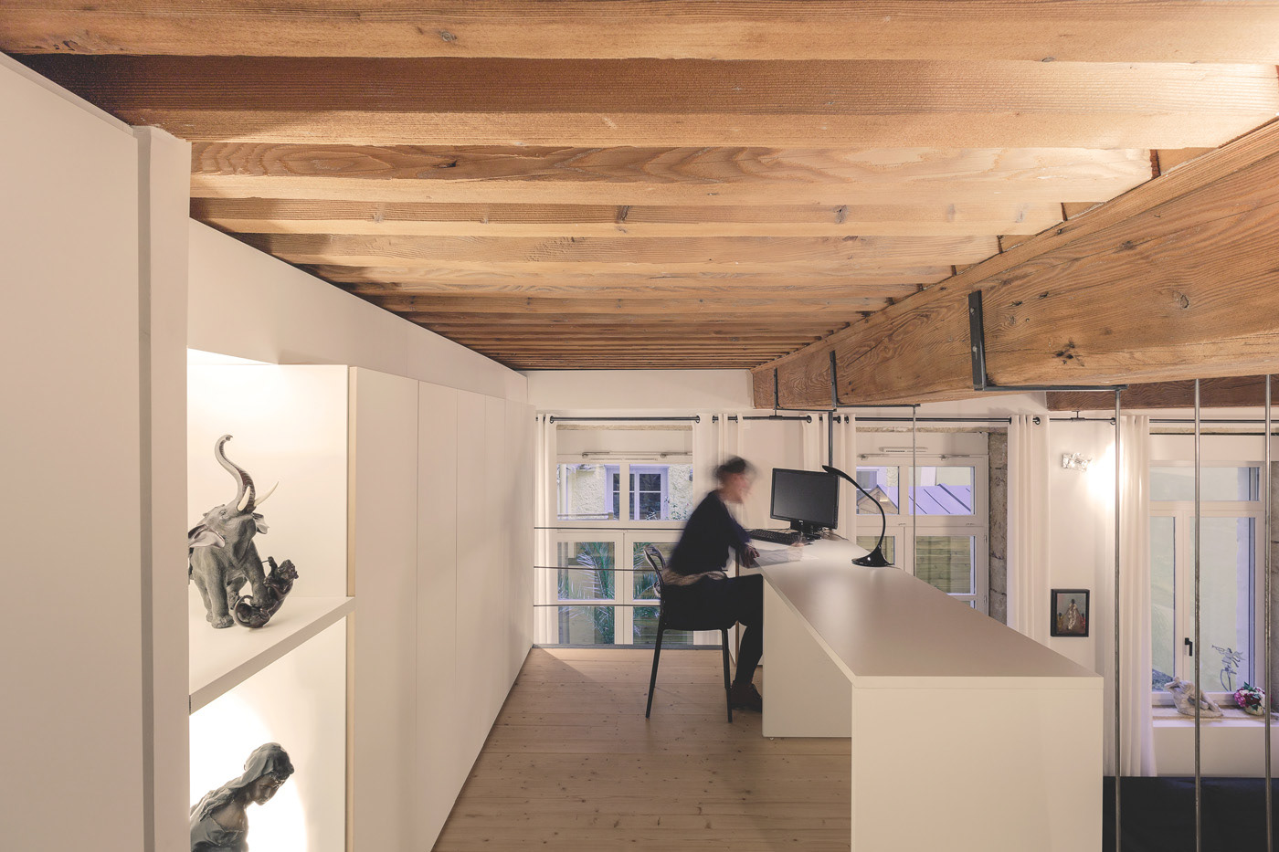 Un travail en détail des menuiseries intérieures, a permis de sculpter des meubles aux usages combinés (escalier/rangement/banquette, bureau/garde-corps), d'exploiter chaque recoin comme rangement tout en favorisant les doubles hauteurs et points de vue ouverts. Des verrières permettent d'intimiser des espaces tout en maintenant les transparences et apports de lumiere.