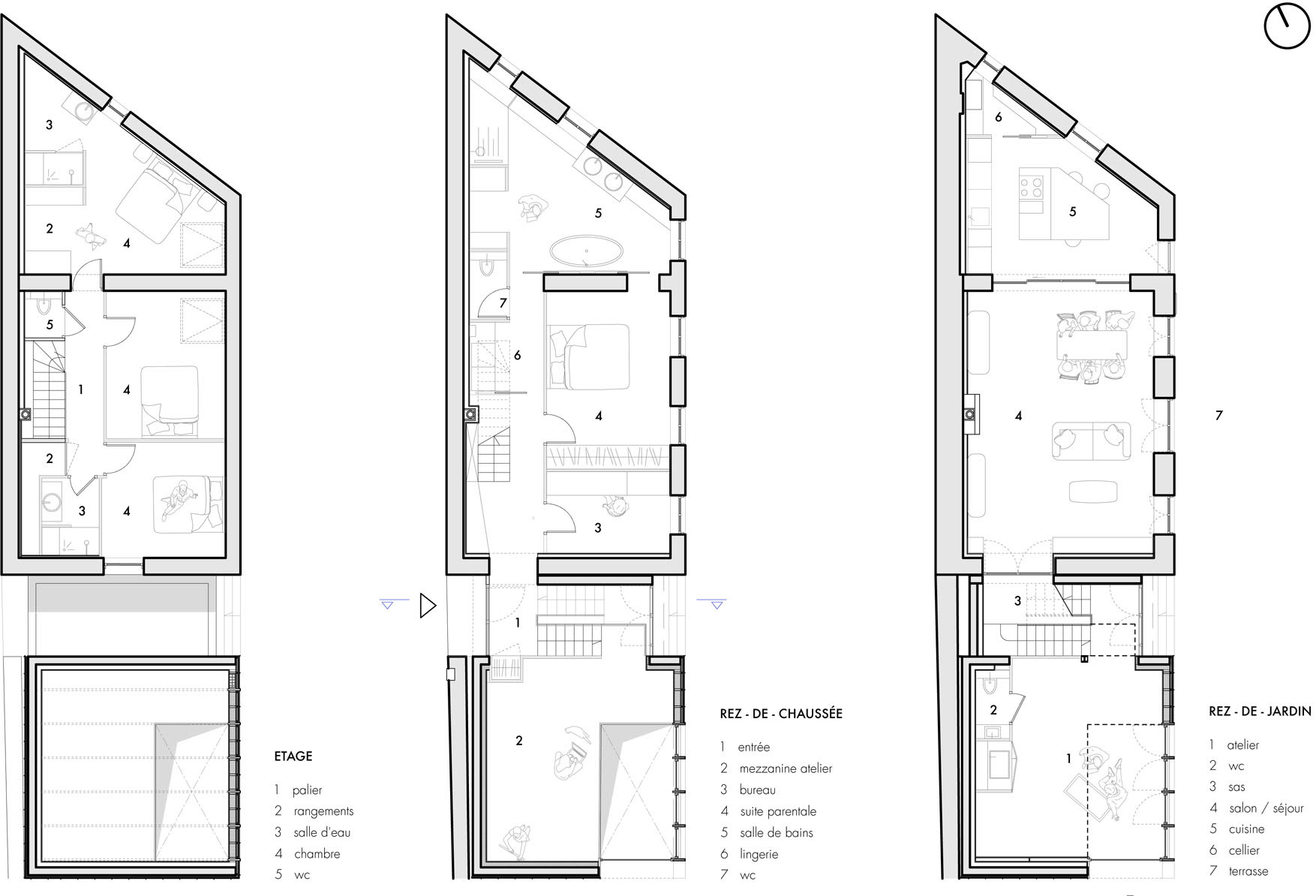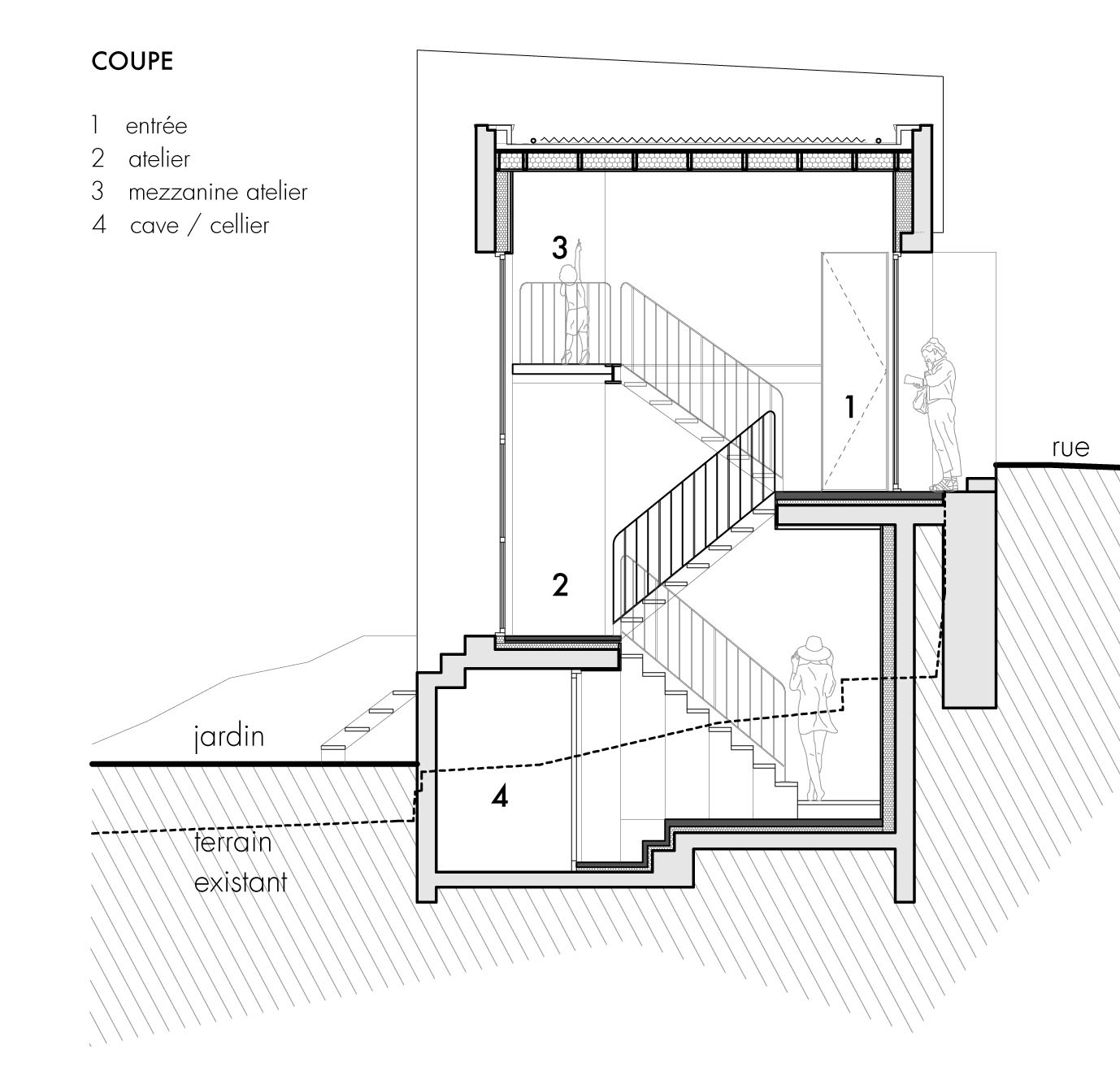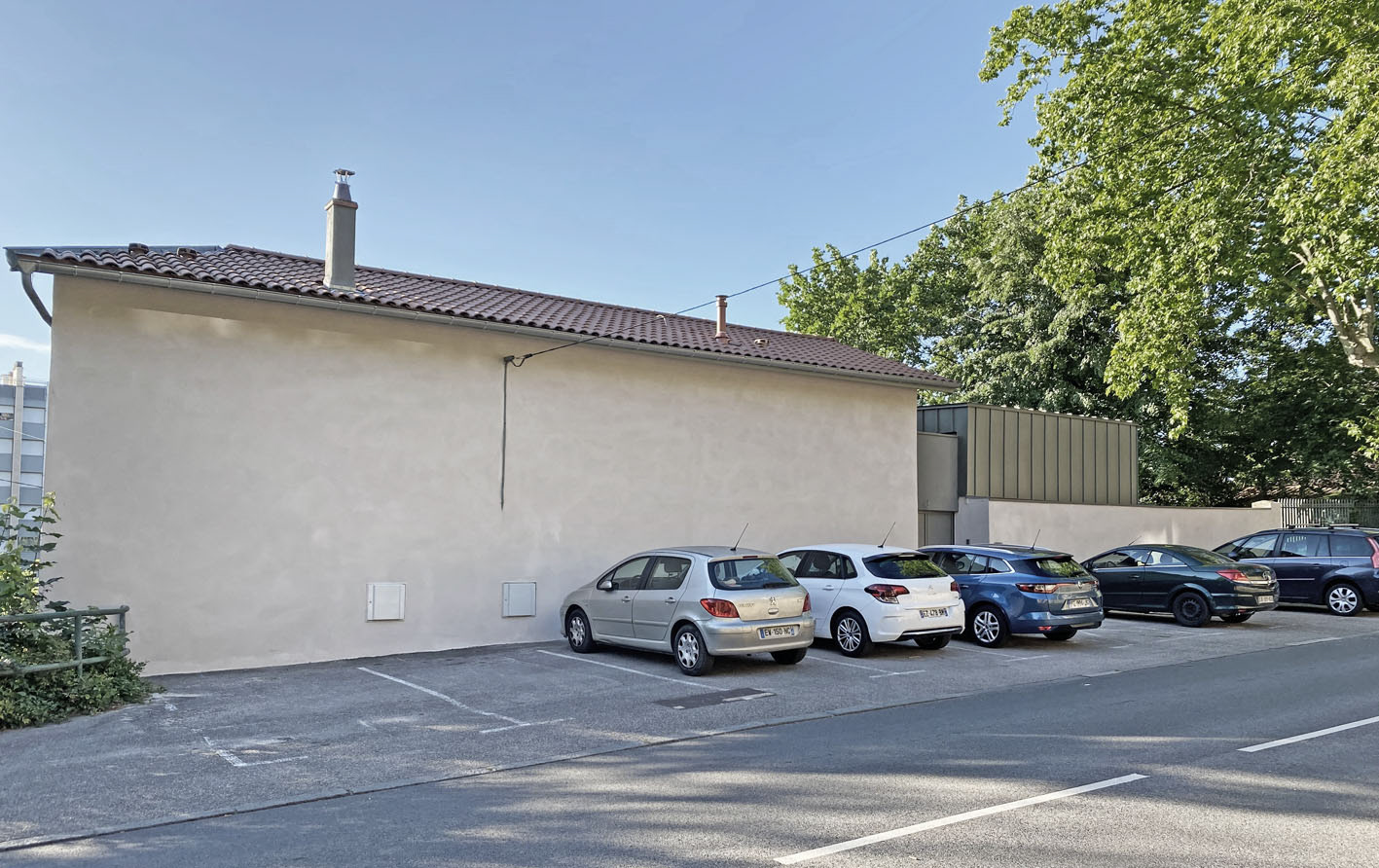 L’extension est implantée en demi-niveau de façon à épouser le terrain naturel et ne pas fragiliser le mur existant. Ce volume simple qui se soumet à la bâtisse existante affirme une écriture contemporaine. Un interstice en creux entre les deux volumes joue le trait d’union en accueillant l’entrée et les circulations verticales.