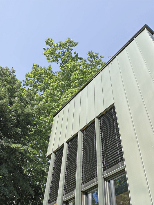L’atelier se pare d’une vêture en zinc gris vert, en écho à l’environnement boisé. De hautes ouvertures rythmées s’ouvrent sur le jardin et soulignent par leur dessin l’influence des anciens ateliers d’artiste.